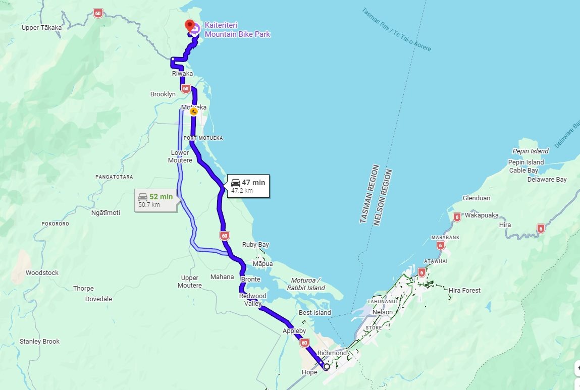 Follow State Highway 6 south to Richmond. Continue straight through the traffic lights. At the roundabout just after the lights, take the exit toward Motueka (State Highway 60).